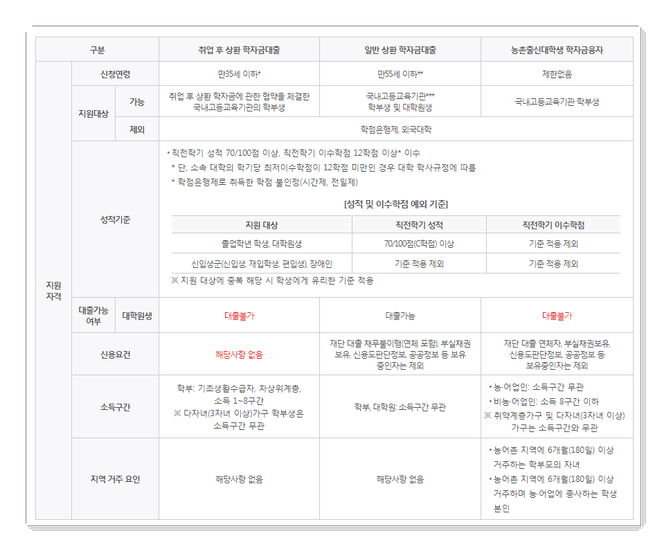 위에 한눈에 보는 학자금대출이 있습니다. 확인해 보시고 어떤 종류의 학자금 대출을 받을것인지 결정하고 보시면 확실히 쉽습니다.