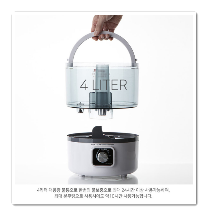 듀플렉스 DP-9990UH은 물통을 통체로 간편하게 세척할 수 있어 더욱 위생적인 간편 세척 대용량 가습기 입니다. 완전 분리형 물탱크로 간편세척이 가능한 듀플렉스 초음파 가습기입니다. 4L의 대용량으로 건조하 새벽에도 끊김없이 최소 12시간이상 사용할 수 있습니다.