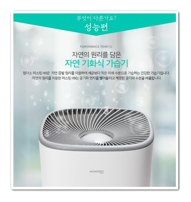원더스리빙 미스킹 H9는 자연기화식 가습기로 자연 증말 원리를 이용하여 세균보다 작은 미세수분으로 가습하는 건강한 가습기 형식입니다. 공기와 먼지를 빨아들이고 깨끗한 공기와 수분을 배출합니다.