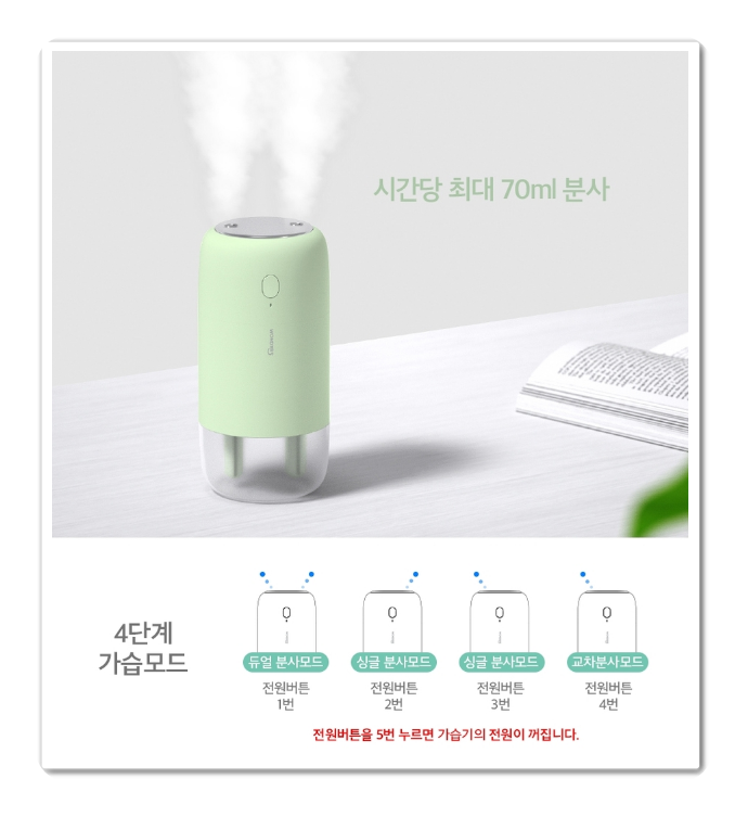 또한, 간편한 필터교체와 간편한 물보충이 쉽습니다. 무선 무드등 미니 가습기 이기때문에 언제 어디서나 수분 보충이 가능합니다. 사무실이나 또는 차안에서도 가능하며 2단계 미스트 분사 기능으로 1단계는 지속분사, 2단계는 2초 분사했다가 1초 정지되고 다시 반복되는 컷오프 스프레이 기능입니다.