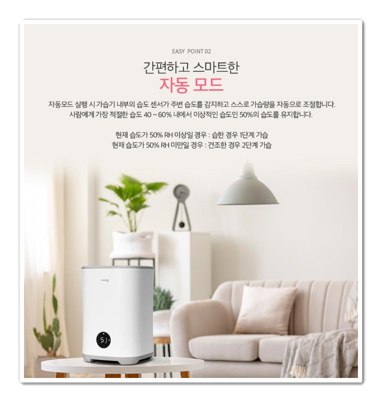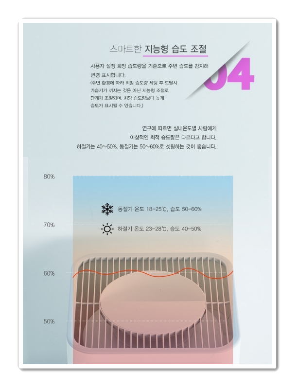 편리한 물보충과 지능형 습도조절로 사용자 설절 희망 습도량을 기준으로 주변 습도를 감지해 변경 표시합니다. 실내온도별 사람에 이상적인 최적 습도량은 다르다고 하나 평균 하절기는 40~50%, 동절기는 50~60%로 하는것이 좋습니다.