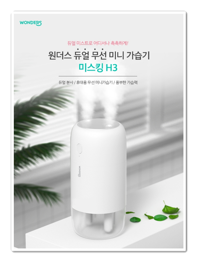 원더스리빙 미스킹 H3는 듀얼 무선 미니 가습기 입니다. 두개의 분사구로 더 풍부한 가습량입니다. 시간당 최대 70ml 분사량으로 환절기 및 겨울철의 실내 습도를 40~60% 수준으로 유지하여 더 부드럽게 더 풍부하게 건간한 수분 밸러스를 유지 할수 있습니다.