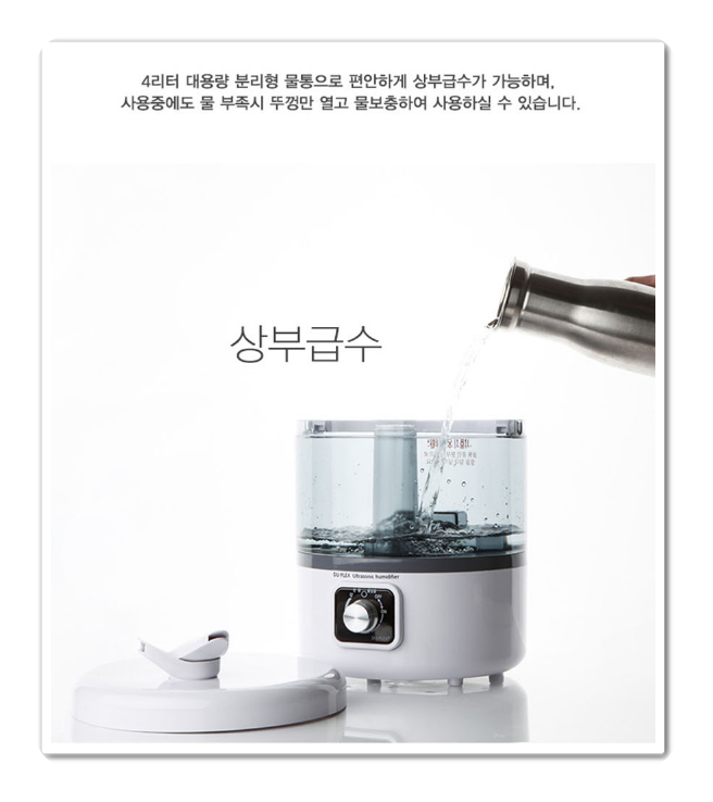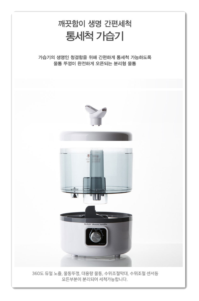 360도 회전 트윈노즐로 자유로운 분무방향으로 원하는 방향으로 가습이 가능합니다. 뚜껑까지 분리하여 구석구석 세척할수 있는 투명한 오픈형 물통 가습기 입니다. 건강에 영향을 미칠수 있는 가습시, 이젠 안심하고 위생적으로 사용하실 수 있습니다.