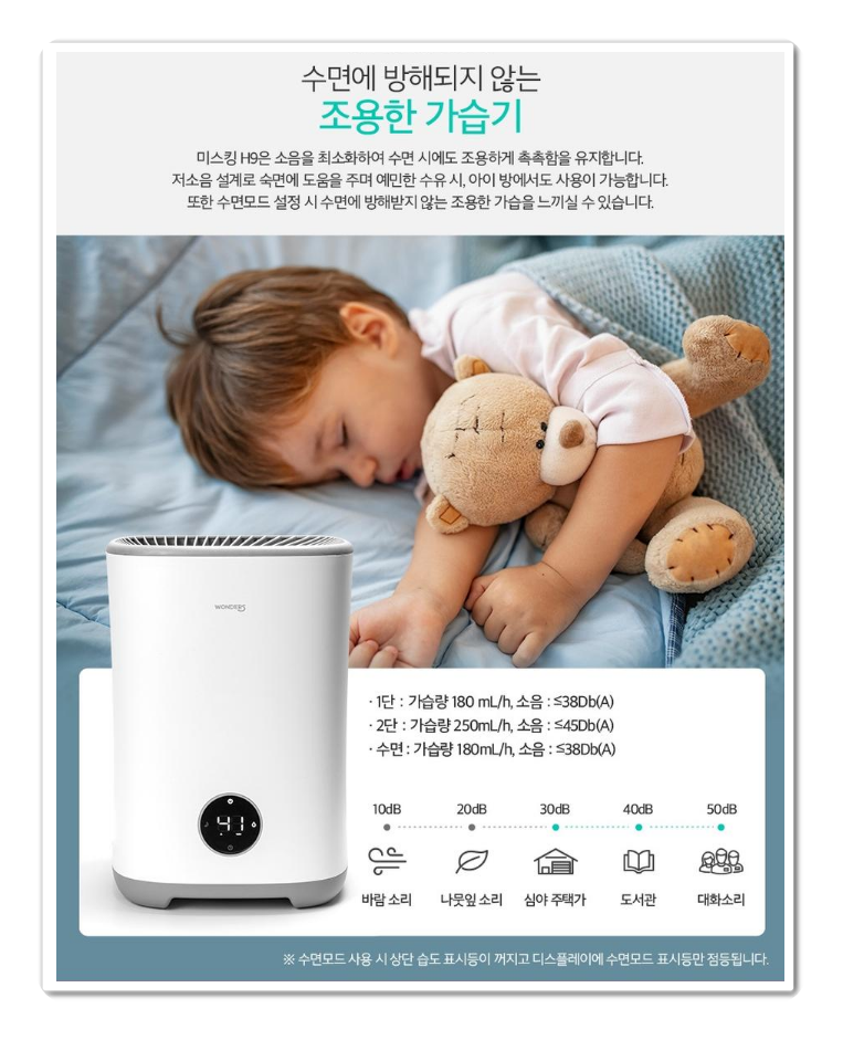 저 소음으로 수면시 편안하게 주무실수 있습니다. 또한 물세척이 가능한 항균필터 이기 때문에 간편하게 손세탁 하여 사용하실수 있씁니다. 시간당 최대 250cc 풍부한 가습량을 뿜어냅니다.