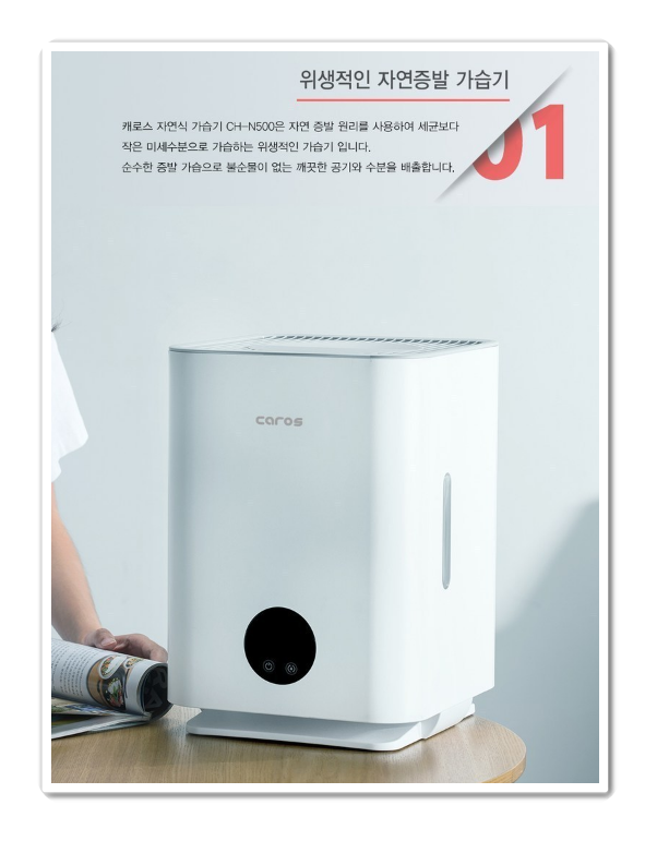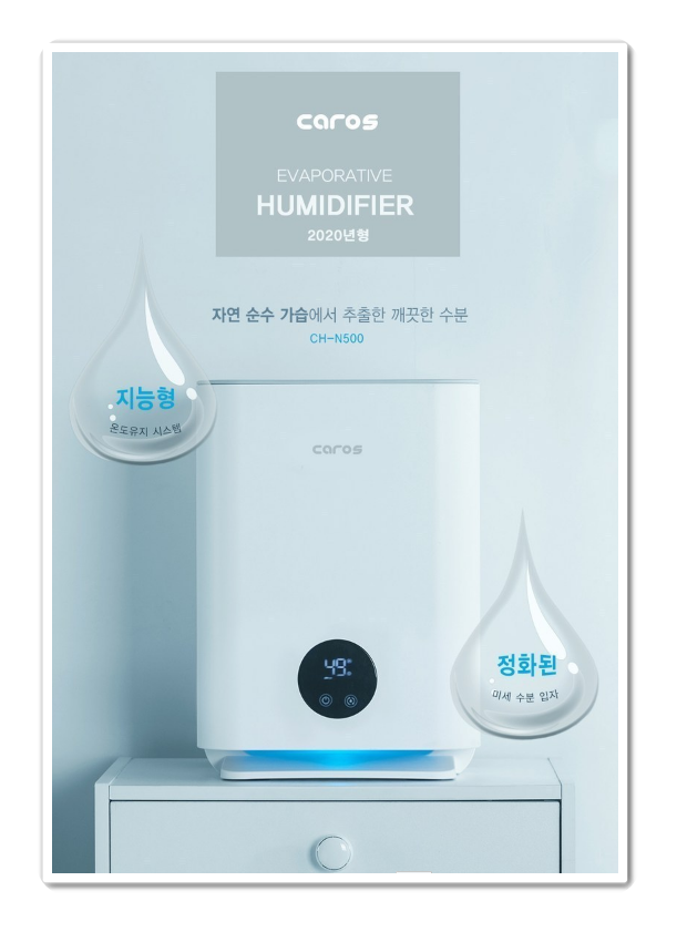 캐로스 CH-N500는 자연증발식 방식으로 세균보다 작은 미세수분으로 가습하는 위생적인 가습기 입니다. 순수한 증발 가습으로 불순물이 없는 깨끗한 공기와 수분을 배출합니다. 또한 절전형 자연식 가습기라서 소음도 20 ~30db로 부드러운 숨소리정도입니다.