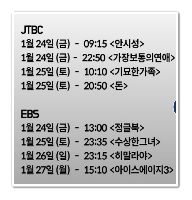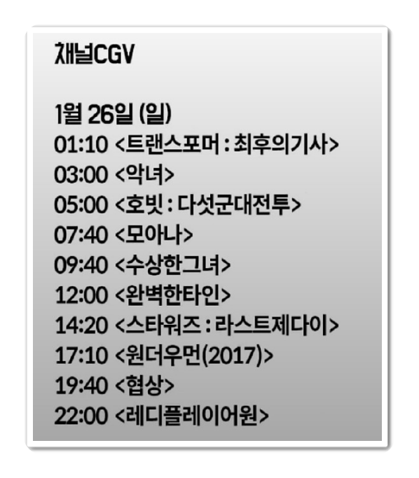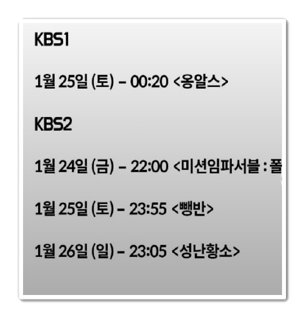 이제 몇일 후면 설날입니다. 설날에 집에 있는 분들 또는 시골에 가시는 분들도 있습니다. 친척네 가도 내집이 아니기때문에 티비나 폰말곤 할것이 없는데요. 그래서 이번에는 2020년 설날 특선영화 편성표를 알아보겠습니다. 이번 설날은 정말 재미있고 인기 많은 영화들이 많이 상영예정입니다. 미리 알아보고 좋아하는 영화를 날짜와 시간체크해서 보는것도 좋습니다. 설날 요일별로 특선영화 편성표를 보겠습니다. 채널별로도 정리되어 있으니 보시기 바랍니다.