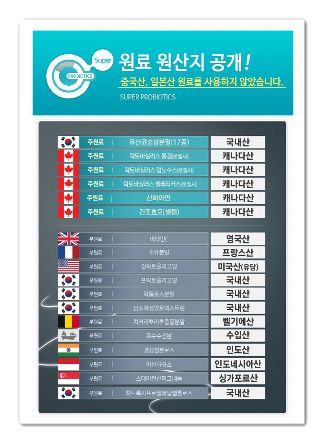녹십자웰빙 슈퍼 프로바이오틱스 유산균은 17종 혼합 유산균이 함유 되어있으며, 신바이오틱스(프로바이오틱스+프리바이오틱스)가 들어있습니다. 또한 특허 유산균 3종을 함유되어 있습니다. 캐나다에서 특허 적용받은 유산균입니다. 원료 원산지 공개로 중국과 일본산은 전혀 사용하고 있지 않습니다.