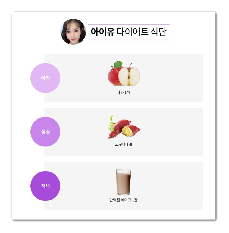 가수 아이유가 식단인데요 하루에 딱 한끼만 먹는 식단입니다. 아이유는 고구마, 단백질쉐이크, 사과 1개로 춤과 노래를 다 소화했습니다. 불가능한 식단이 아닙니다. 식단이 적어도 활동을 하거나 운동을 한다면 신테에 아무런 지장이 없습니다.