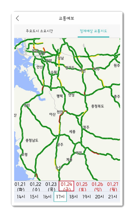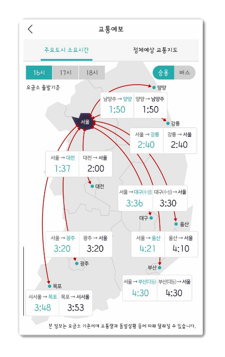 - 전국적으로 혹은 권역별로도 정보를 실시간으로 확인을 할수 있습니다. 또한 교통 예보도 확인 가능합니다. 주요도시 소요시간과 정체예상 교통지도까지 다 확인이 가능합니다. 요금소 기분, 교통량과 돌발상황 등에 따라 달라질수 있으니 참고하시기 바랍니다.