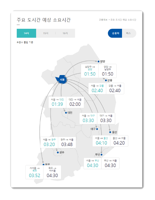 - 귀성길에 승용차 이용시 고속도로에서의 최대 소요시간은 서울~대전은 4시간 20분 예상, 서울~부산 8시간 10분예상, 서울~광주 6시간 50분 예상, 서서울~목포 7시간 10분예상, 서울~강릉 4시간20분 예상됩니다.