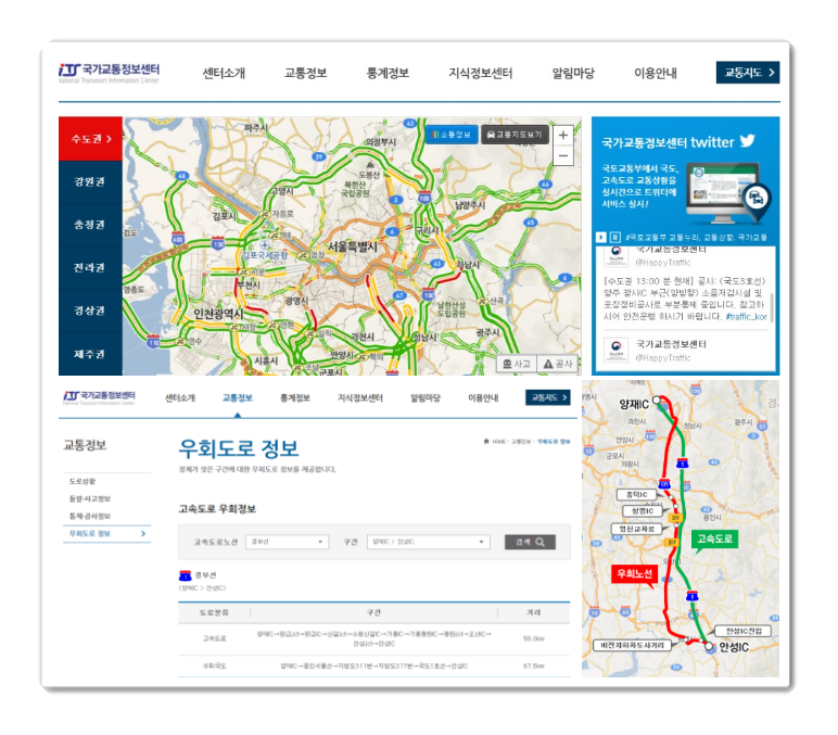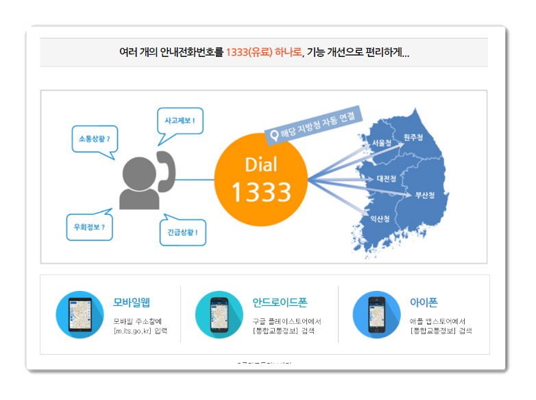 - 국가 교통정보센터의 통합교통 정보는 휴대폰 어플로도 다운로드 가능하며, 어플이 어려우신 분들은 1333유료 ARS 서비스를 활용하여 도로위에서의 다양한 궁금증을 해결하시면 좋습니다.