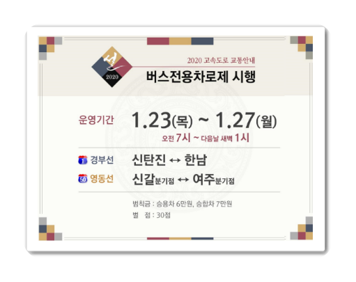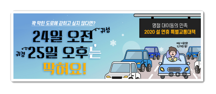 설날 연휴가 코앞으로 다가왔습니다. 다들 오랜만에 보는 가족과 친척들 생각에 들떠 있다고 생각됩니다. 오랜만에 본다고 좋지만 시골까지 가야하는 힘든 여정이 있지만 이번 설날은 다른 해에 비해 다소 짧은 명절이기 때문에 대부분 고향길을 가는 일정을 평소보다 더 빠르게 앞당겨서 움직인다고 합니다. 장거리 운전자분들은 그리운 가족들을 보러 가는것도 좋지만 운전의 피로를 급격히 쌓이게 되는데요. 이번에는 2020년 설날 교통을 실시간 확인하는 방법과 혼잡시간대를 알아보겠습니다.