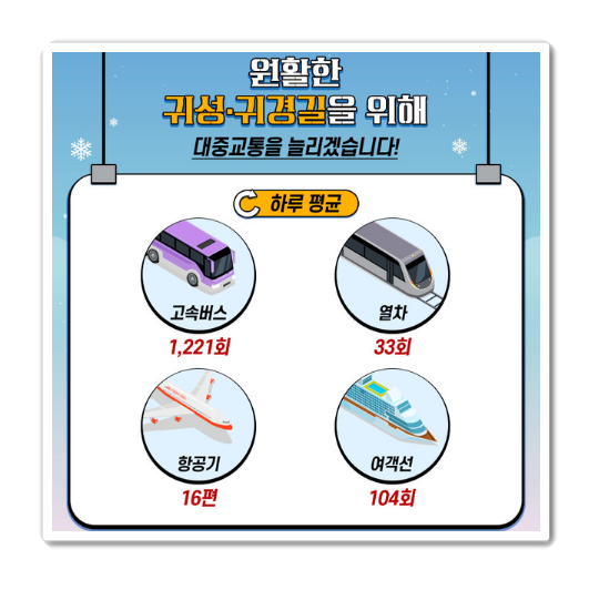 또한 2020년 설날 도로 혼잡 시간대를 고려햐, 고속버스와 항공기, 열차 운행, 여객선 운행 횟수를 늘려 대중교통을 이용하는 사람들이 늘어나도록 확대합니다. 고속버스 운행 횟수는 평소보다 1일 평균 1221회로 늘렸습니다. 열차는 하루 평균 33회 정도 더 늘렸습니다. 일부 열차 운임금액은 30~50%정도 저렴하게 할인판매 할계획이라고 합니다. 항공기는 국내선 항공기 기준으로 운항 횟수 하루평균 16편정도 늘어납니다.