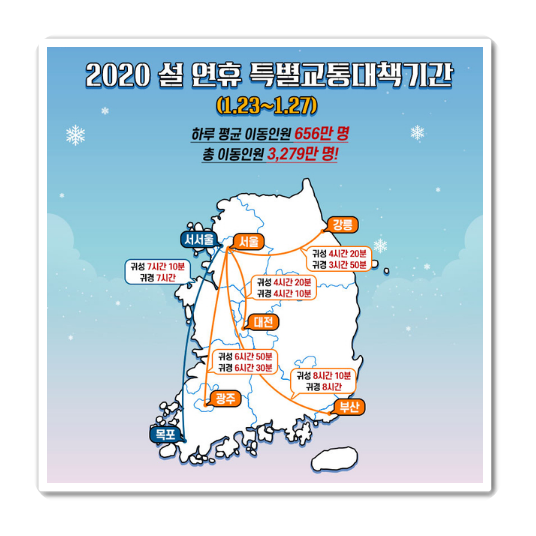 2020년 설날은 작년에 비해 5.3%가 증가 했다고 합니다. 고향길 오르시기 전에 교통 예보 정보를 미리 확인해서 출발하는것이 좋겠습니다. 올해 설날 연휴는 귀성실 전날인 24일 오전에 가장 혼잡할 것으로 예상이 되며, 귀경길은 설날 당일 25일 오후가 가장 혼잡할 것으로 예상이 된다고 합니다.