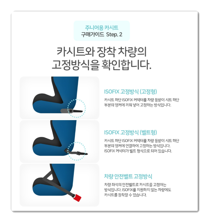 카시트는 아이의 연령과 체중에 따라서 종류가 크게 신생아용, 유아용, 주니어용이 있습니다. 신생아는 개월수로 많이 하고 있습니다. 그 위에는 아이마다 체격이 다르기 때문에 대부분 몸무게로 카시트를 정하고 있습니다. 아이들은 금방 크기때문에 금방 바꿀수도 있습니다. 기본 2번이상은 카시트를 바꿔야 한다고 생각합니다.