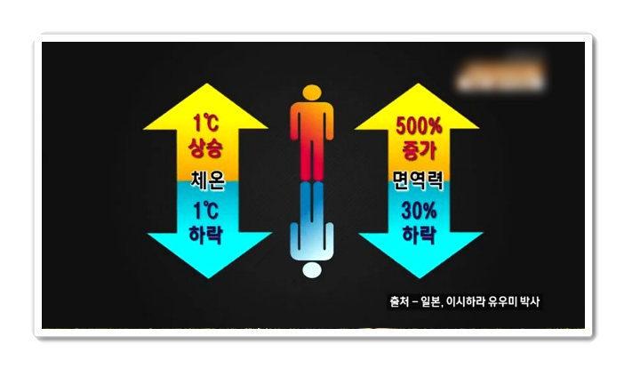 - 추운 겨울철 면역력을 높이기 위해서는 적정한 체온을 유지해야합니다. 체온이 1도라도 내려가면 신진대사 기능이 12%가 감소하고 몸안의 효소 기능이 50% 떨어진다고 합니다. 몸에 냉기가 많아지면 혈관이 수축하고 혈액순환도 원활하지 못하여 면역력이 떨어집니다. 체온을 높이기 위해서 따듯한 물에 몸을 담그고 있거나 더운 성질을 가지고 있는 식품이나 차를 마시는것도 좋습니다.